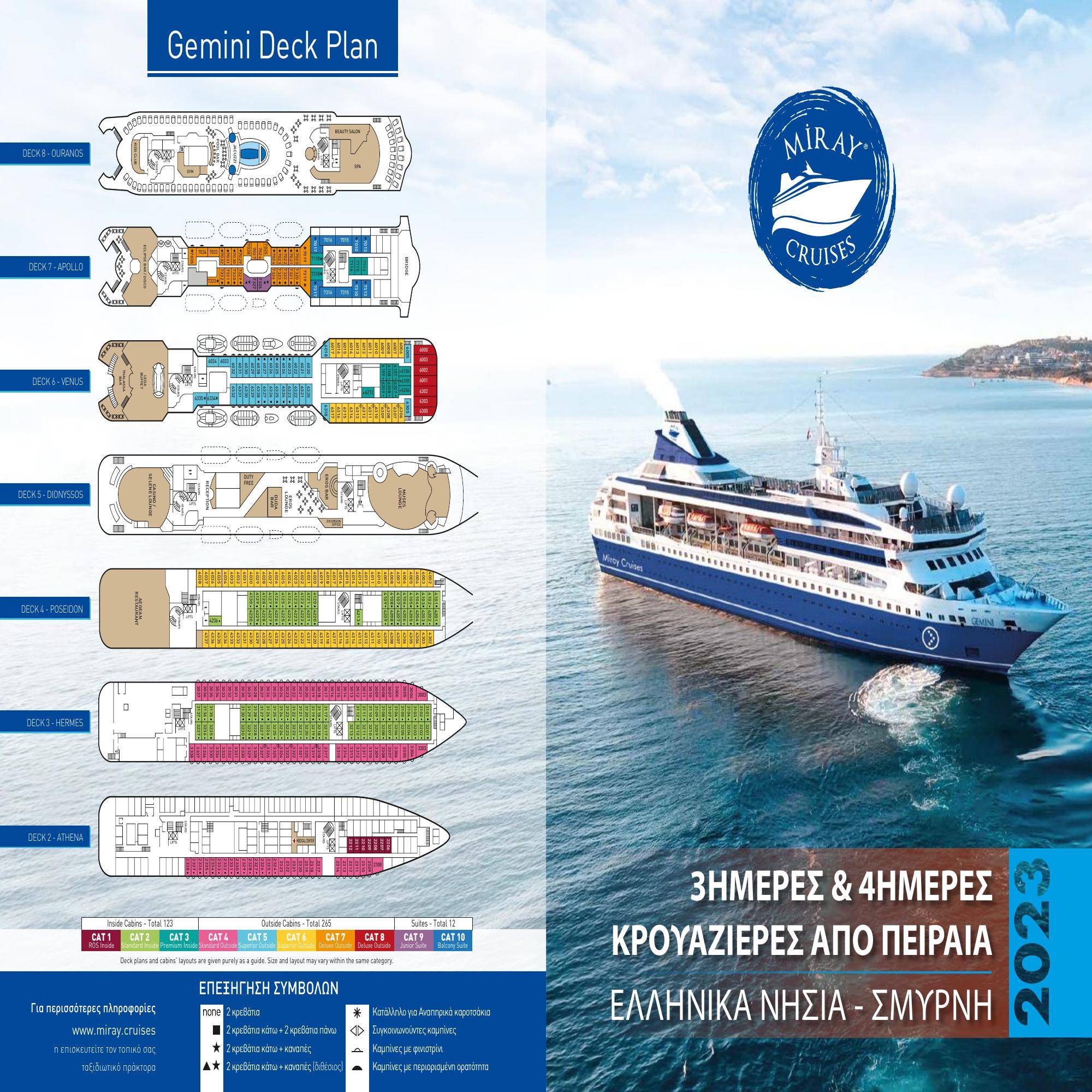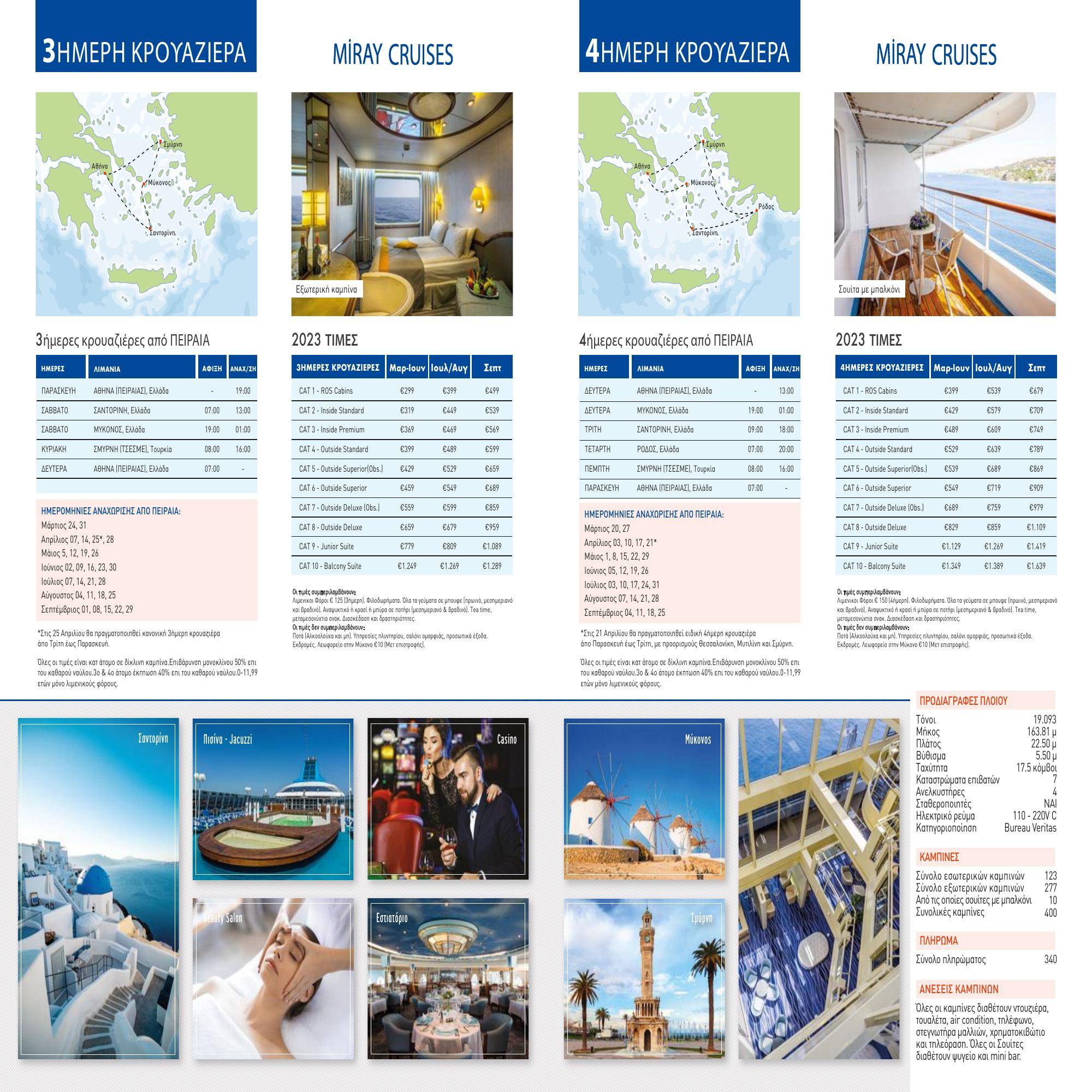 Πρωινή άφιξη στη Σαντορίνη, η οποία είναι το νοτιότερο νησί του Κυκλαδικού Συμπλέγματος και καλύπτει επιφάνεια 46 τετρ. χλμ. Το 1500 πΧ, η ηφαιστειακή έκρηξη δημιούργησε το νησί της Σαντορίνης καθώς επίσης και τα γειτονικά νησιά της Παλαιάς και Νέας Καμένης και της Θηρασιάς. Σε υψόμετρο 300 μέτρων από την επιφάνεια της θάλασσας βρίσκονται τα Φηρά, η πρωτεύουσα του νησιού της Σαντορίνης. Ο καταστροφικός σεισμός του 1956, κατέστρεψε μεγάλο μέρος του νησιού το οποίο συνεχώς ανοικοδομείται μέχρι σήμερα. Το πιο χαρακτηριστικό γνώρισμα του νησιού είναι οι εκκλησίες με τους μπλε θόλους. Το ηφαιστειακό έδαφος της Σαντορίνης δίνει λίγα αλλά εξαιρετικής ποιότητας αγροτικά προϊόντα όπως ελιές, τοματίνια, λευκές μελιτζάνες και εξαιρετικής ποιότητας σταφύλια από τα οποία παράγονται τα εκλεκτά κρασιά της Σαντορίνης. Επισκεφτείτε τα Φηρά και την Οία ή μπορείτε να διαλέξετε προαιρετική εκδρομή. Μεσημεριανό εν πλω καθώς το πλοίο αναχωρεί για τη Μύκονο. Απογευματινή άφιξη στη Μύκονο. Αποβιβαστείτε από το πλοίο και περπατήστε στα στενά και γραφικά στενά της Μυκόνου. Δείτε την εκκλησία της Παναγίας της Παραπορτιανής. Τα γραφικά μαγαζιά στα Ματογιάνια και στην Μικρή Βενετία σας περιμένουν για να απολαύσετε το ποτό ή τον καφέ σας. Περνώντας από την Μικρή Βενετία θα καταλήξετε στους παραδοσιακούς ανεμόμυλους, το υψηλότερο σημείο της πόλεως της Μυκόνου όπου μπορείτε να χαρείτε ένα εντυπωσιακό και ρομαντικό ηλιοβασίλεμα, πριν επιστρέψετε στο καράβι που θα συνεχιστεί η διασκέδασή σας.